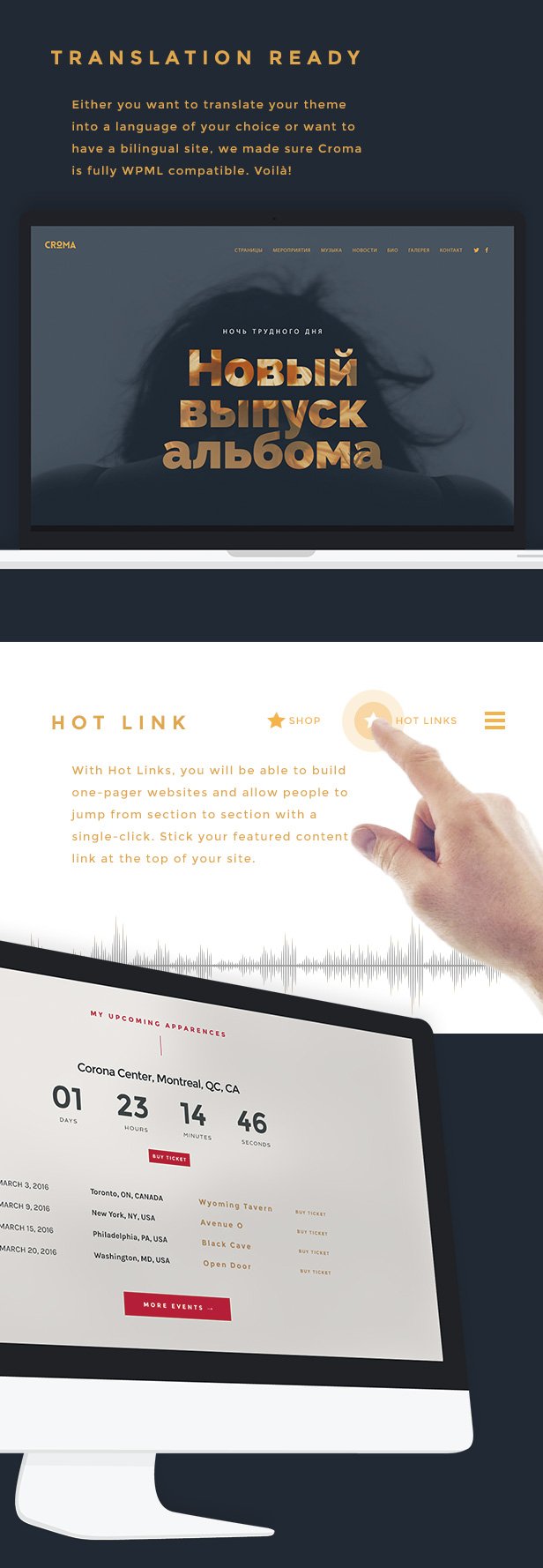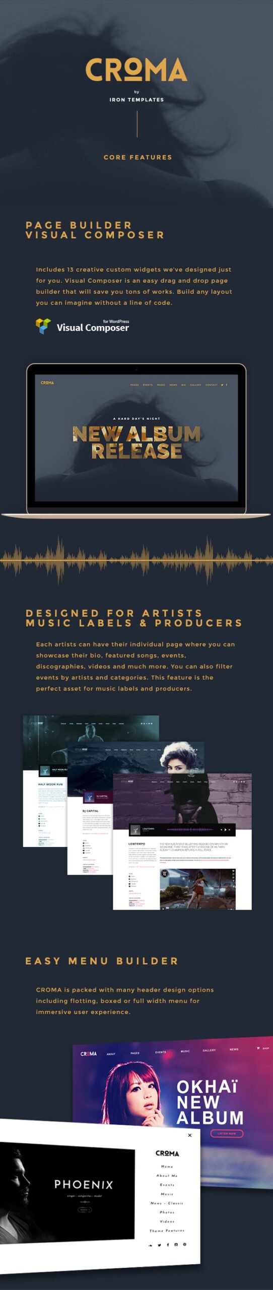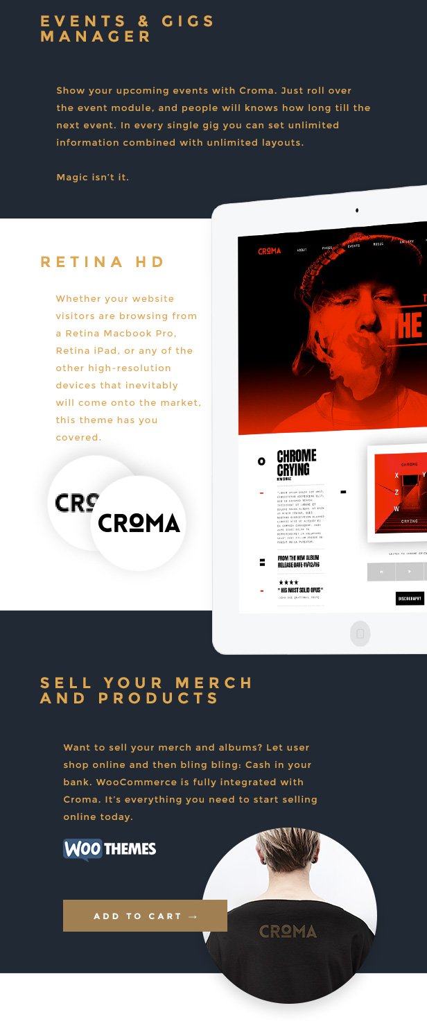Croma has been carefully designed and developed from the ground up for today’s music industry. With Croma, there are plenty ways to show your artworks, albums and music with full integration of all the social media networks needed to promote and share your music and pages that make sense to the musician/artist in you. This includes Event, Gig and Tour pages, the all important Contact page, of course incredibly cool ways to play and preview your latest work and deep integration with WooCommerce so that you can monetize your site with a wicked online store.