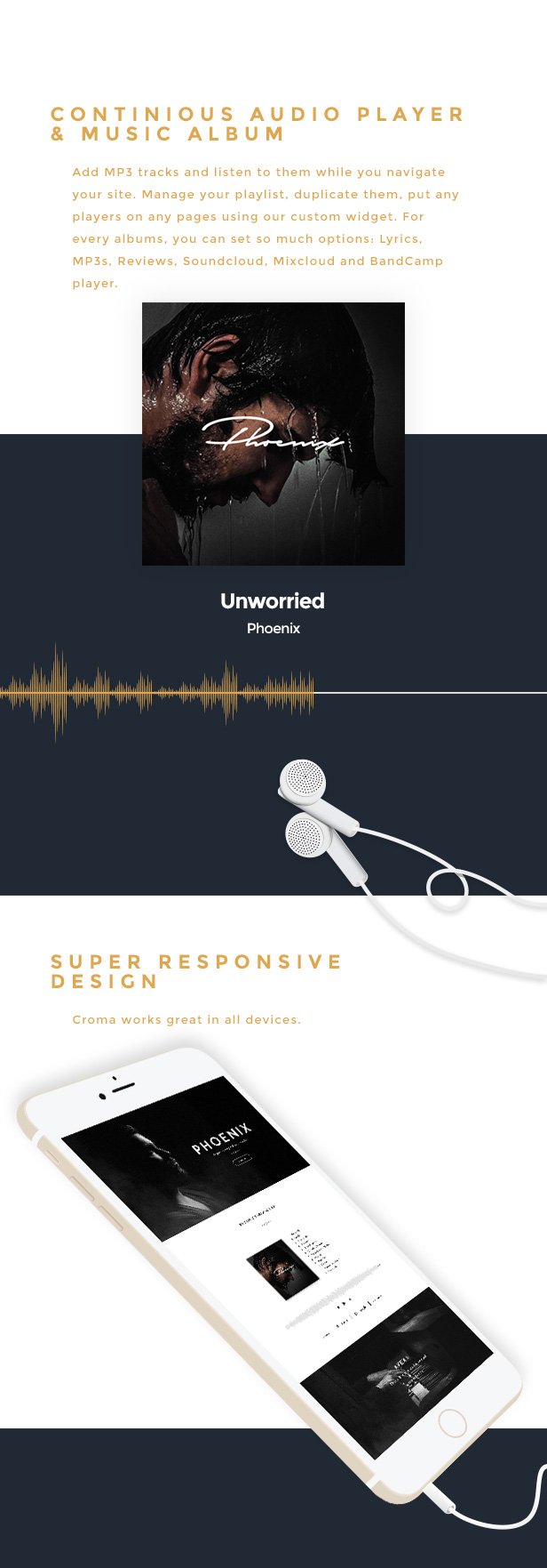 Croma gives you the edge with Ajax Audio Player for Continuous Playback of your music as your fans browse your music website. Responsive, modern, get the professional look & sound. Croma is the perfect multi-purpose WordPress theme for Musicians, Music Bands, DJs and producers.