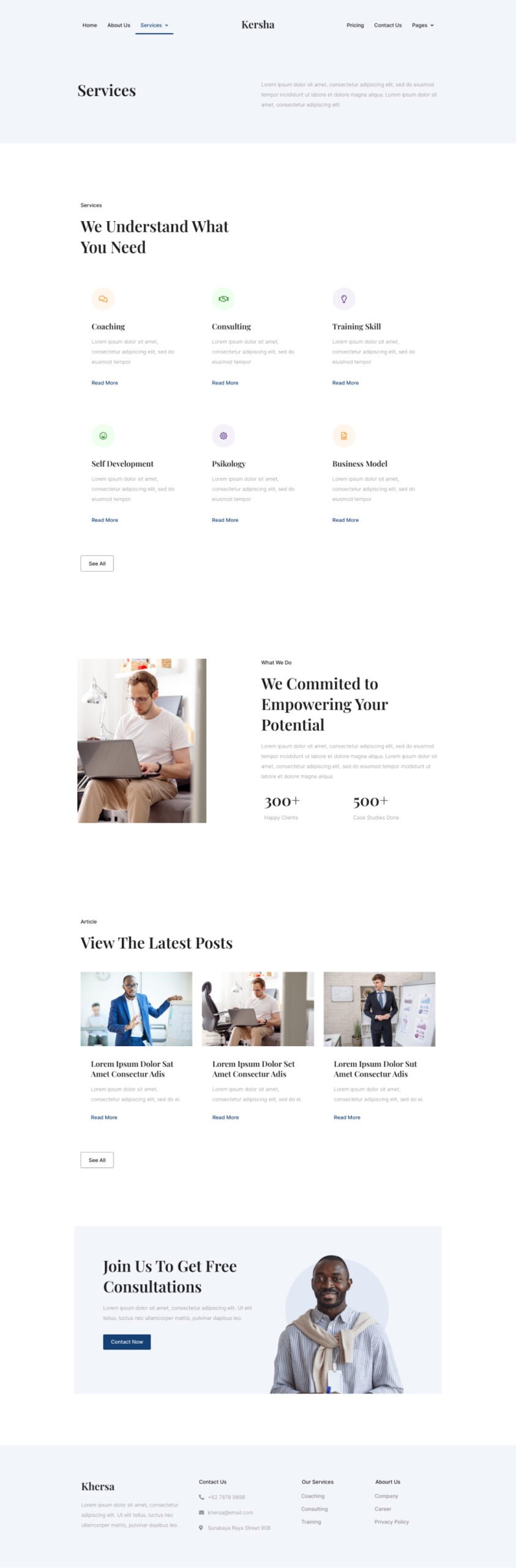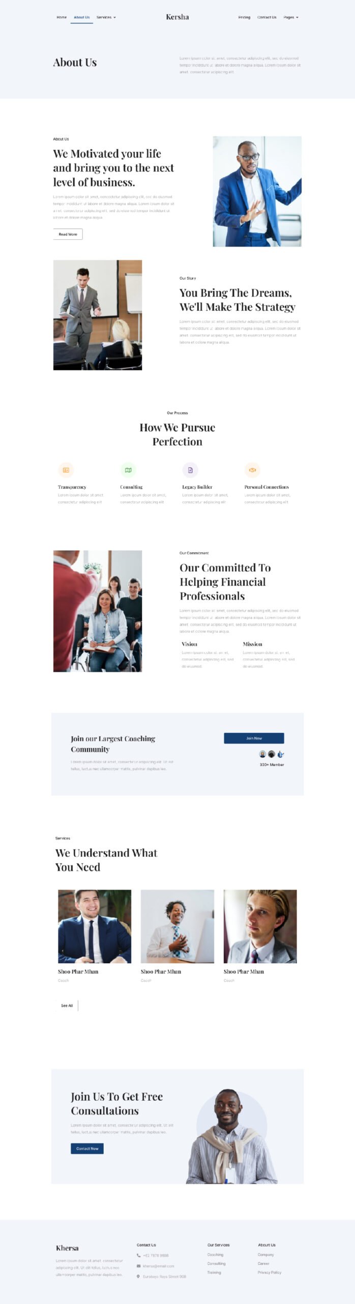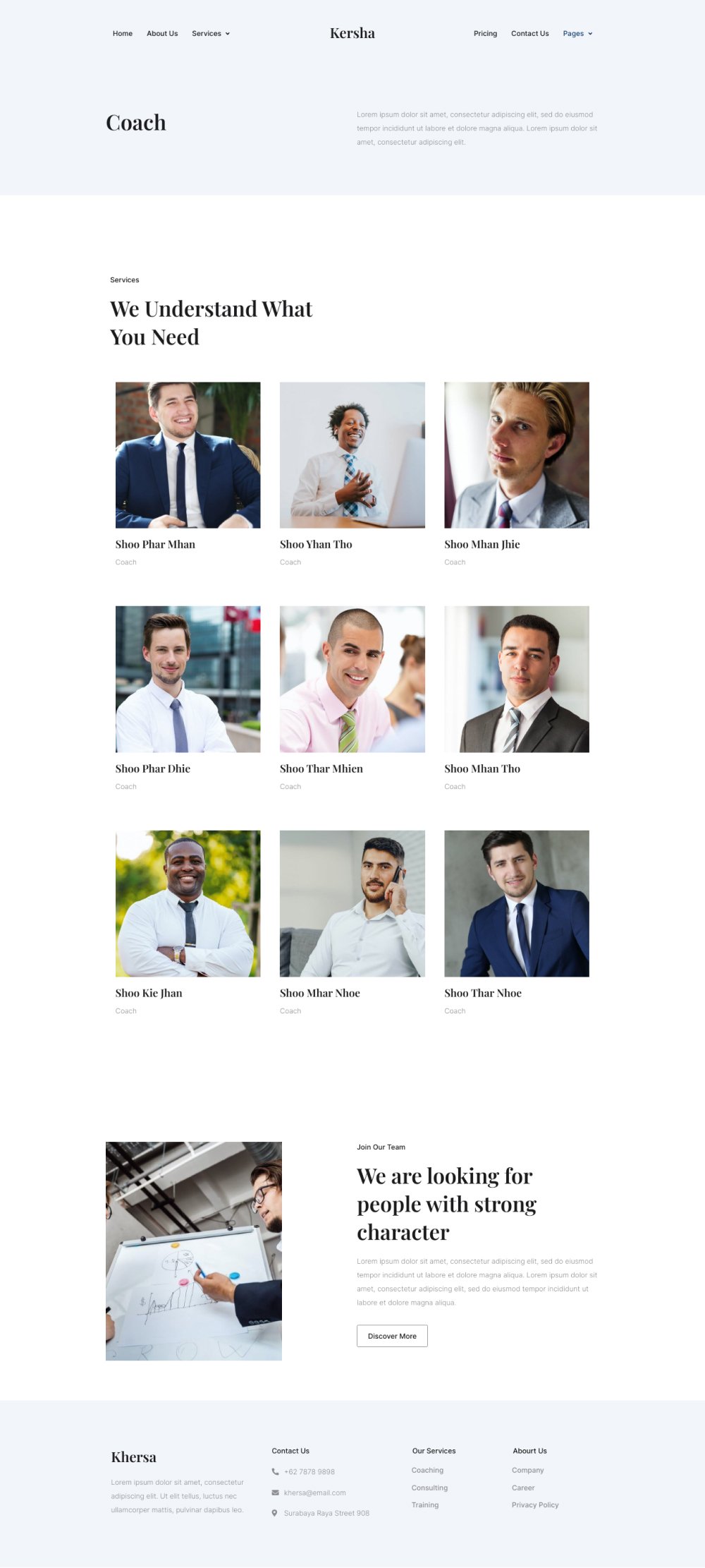 Template includes: *Home *About Us *Services *Pricing *Contact Us *Appointment *Career *Blog *Single Post *Coach *404 Error Page